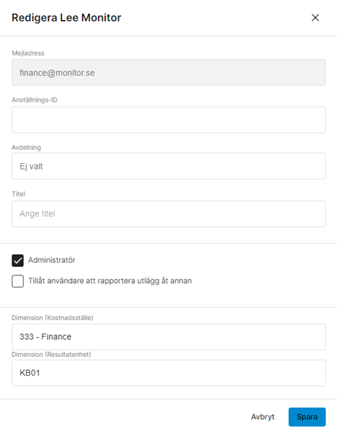 Genom att klicka på en användare, kan du ändra dess Avdelning och Anställningsnummer. Du kan också göra dem till en Administratör, eller Tillåta dem att hantera utlägg åt någon annan. Antal fält som finns att justera på användaren kan variera beroende på din organisations inställningar.