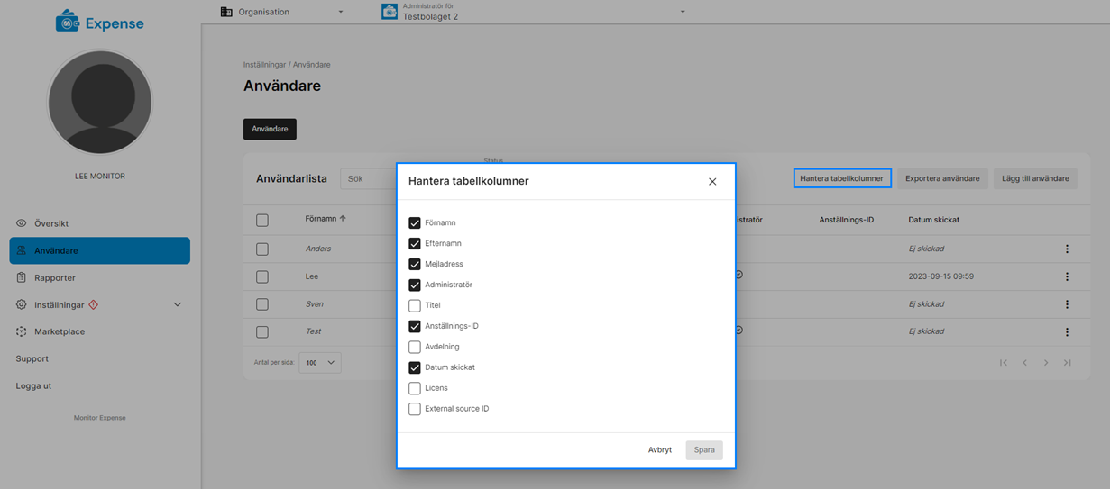 Om man klickar på Hantera tabellkolumn så kan du välja vilka kolumner som ska visas under fliken användare.