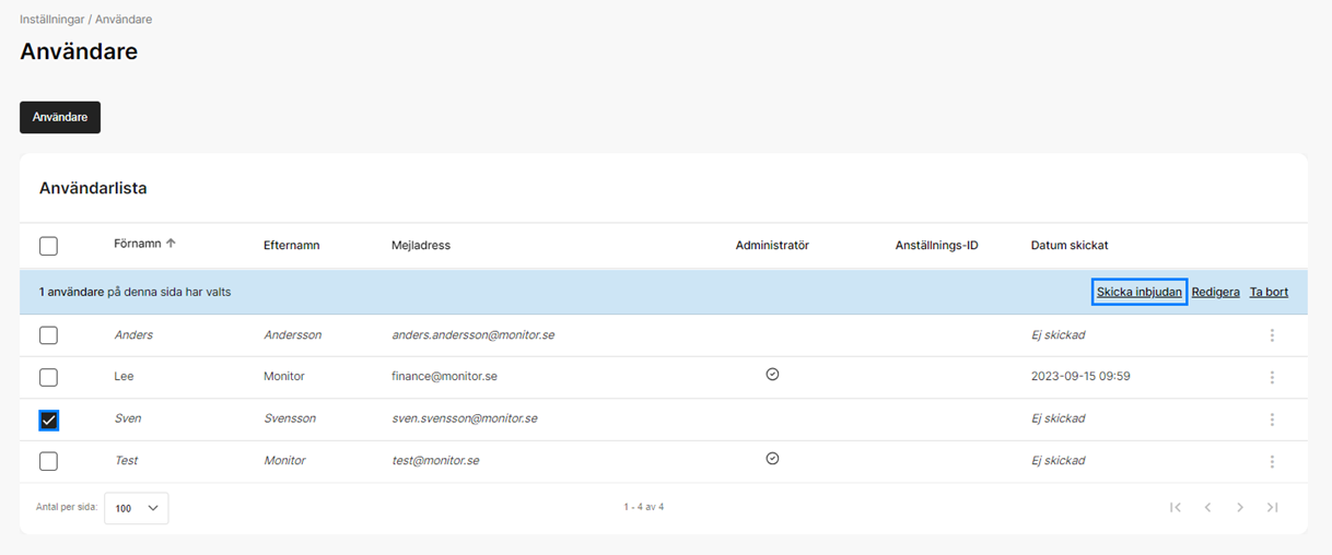 Om du har en användare som du inte bjudit in ännu eller som du vill skicka om en inbjudan till, så markerar du den eller de användare som du önskar att skicka inbjudan till och väljer sedan Skicka inbjudan i den blå menyraden som visas högst upp i användarlistan.
