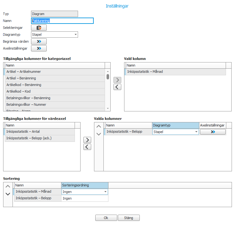 Du väljer en kolumn som ska visas på kategoriaxeln (x-axel) samt vilka kolumner som ska visas på värdeaxeln (y-axel). För varje kolumn på värdeaxeln kan du välja Diagramtyp och under knappen Axelinställningar