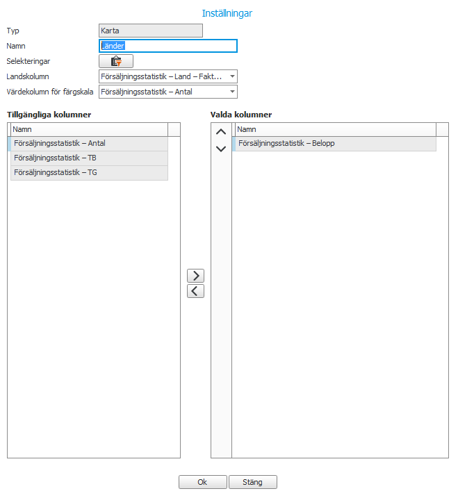 Du ställer här in vilken värdekolumn som färgskalan ska baseras på i jämförelse mellan länder. Den valda kolumnen flyttas till Valda kolumner i tabellen nedan.