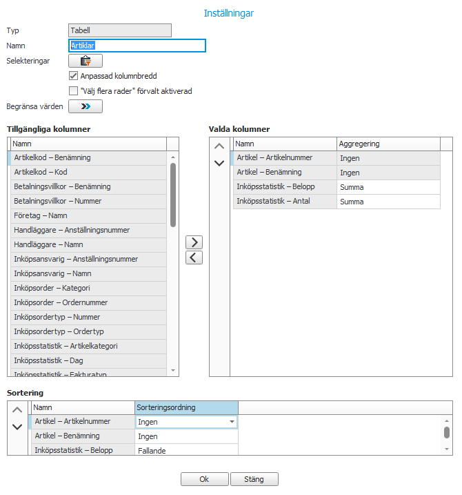 Du väljer vilka kolumner som ska visas i tabellen. Du kan välja aggregering som summa eller medelvärde för varje kolumn. Då visas en summering eller medelvärde under kolumnen.