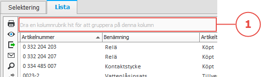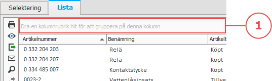 Längst upp i alla listor finns ett interaktivt grupperingshuvud (1). För att gruppera så drar du en kolumnrubrik från listan med muspekaren och släpper den på grupperingshuvudet. Du kan gruppera i flera nivåer genom att dra flera kolumnrubriker till grupperingshuvudet. Omvänt kan du också ta bort en gruppering genom att dra en kolumnrubrik från grupperingshuvudet och släppa mellan två andra kolumnrubriker i listan. Då flyttas den kolumnen tillbaka till listan.