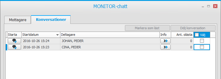 I fliken Konversationer lagras chattarna i konversationer och där kan du se när de startades och se information om vilka som var deltagare samt se om det finns olästa meddelanden i chatten. Du kan markera dem som lästa eller dölja dem. Du kan även starta en lagrad chatt på nytt. Då ser du alla meddelanden i chattfönstret.