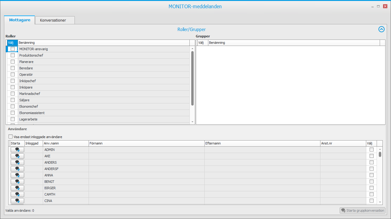 . En chatt är snabbmeddelanden mellan dig och andra användare i MONITOR. I chattprogrammet finns det en flik där du väljer vilka användare som du vill chatta med. I en annan flik kan du se sparade chattar. Här kan du även välja att markera dem som lästa, dölja dem eller starta en chatt på nytt. Chattfönstret liknar andra program för snabbmeddelanden, exempelvis Skype. Chattprogrammet i MONITOR är även användbart för att skicka filer och MONITOR-hyperlänkar mellan användare.