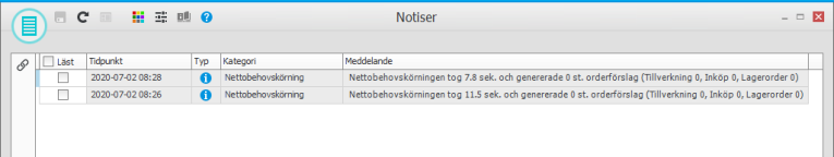 . Notiser är olika meddelanden som systemet skickar i syfte att flagga upp olika saker som du ska utföra eller som har utförts. Det kan exempelvis vara att en nettobehovskörning är klar. Det kan också vara olika meddelanden från Monitor ERP System AB, exempelvis om att en ny version av MONITOR G5 finns tillgänglig.