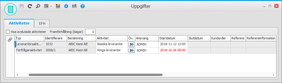 I fliken Aktiviteter kan du ändra på det mesta av informationen på en aktivitet, utom nummer, typ och identifierare. Du har också möjlighet att avsluta aktiviteter. Du kan välja att visa Avslutade aktiviteter, Förfallna ej startklara aktiviteter samt Kommande startklara aktiviteter. Alternativen Förfallna ej startklara aktiviteter samt Kommande startklara aktiviteter gäller enbart projektaktiviteter som har relationer. Med Tidshorisont (dagar) kan du välja hur många dagar framåt som du vill se aktiviteter. När du sparar en aktivitet som avslutad visas en texteditor i ett fönster, där kan du ange ett ämne och skriva en text om den utförda aktiviteten. Du kan också koppla filer till den utförda aktiviteten.