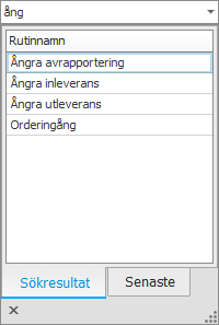 I fältet Sök rutin (Alt + D) på namnlisten i MONITOR G5 finns en snabbsök för att hitta och öppna rutiner. Den är ett alternativ till att leta reda på och öppna rutiner på modulmenyn. Det görs en mönstersökning av den text du knappar in. Om du exempelvis börjar att skriva "ång" så kommer du att få träff på de rutiner som innehåller "ång" i namnet, som Ångra inleverans och Orderingång.