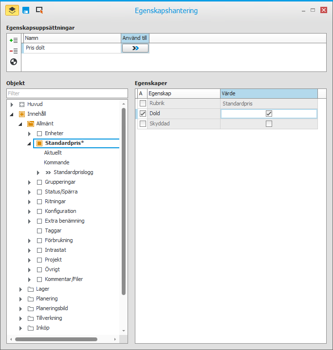 I en egenskapsuppsättning markerar administratören ett Objekt i trädstrukturen (t.ex. ett fält) och väljer vilka Egenskaper som ska användas på objektet, genom att bocka i kryssrutan A (Använd) samt anger eller väljer ett Värde för egenskapen.
