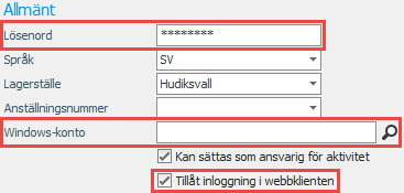 - Användarens konto kan även kopplas till ett konto i Windows med inställningen Windows-konto. Inget lösenord behöver då anges i lösenordsfältet. Användarens lösenord till Windows-kontot används då vid inloggningen i webbklienten.
