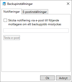 På fliken Notifieringar kan du aktivera att notiser ska skickas via e-post till den/de mottagare du anger i fältet i de fall ett backupjobb misslyckas. Du kan ange flera e-postadresser separerade med semikolon (;) i fältet. Med knappen Testa e-post kan du skicka e-post till mottagare för att kontrollera funktionen.