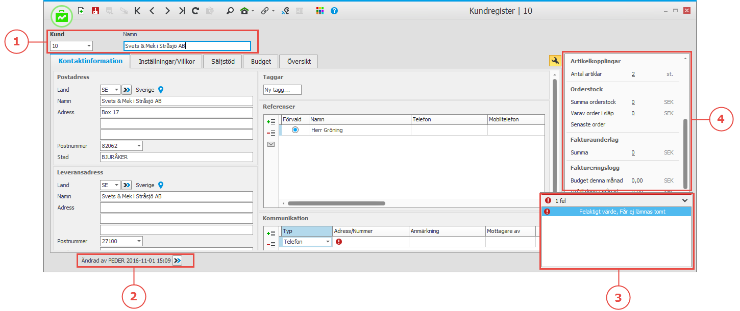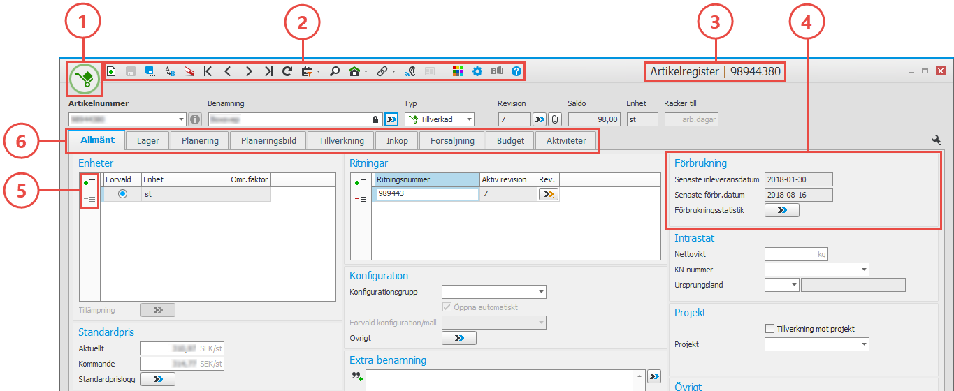 Enpostrutiner används för att registrera och uppdatera en datapost åt gången. Det är dataposter som innehåller mycket information som exempelvis artiklar, kunder och kundorder. Rutinfönstren innehåller även följande delar: Huvudrad (1) med postväljare, Statusrad (2) med information om när posten senast ändrades och skrevs ut, Valideringsruta (3) som visar eventuella varningar och fel från olika valideringar i rutinen, Sidopanel (4) med användbar information från olika register kopplat till den aktuella dataposten.