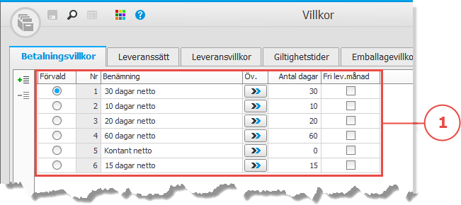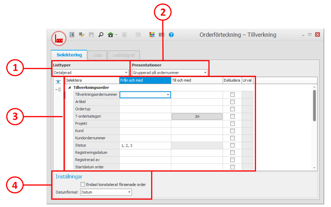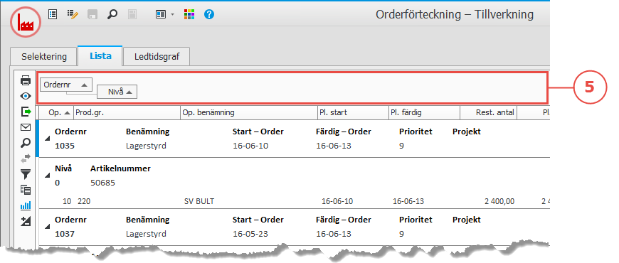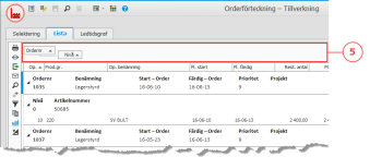 Listrutiner används för att selektera och hämta upp flera dataposter till olika listor för utskrift och rapportering. Rutinfönstren innehåller även följande delar: Listtyper (1), Presentationer (2), Selekteringsrader (3), Inställningar (4) och Grupperingshuvud i listor (5). Några listor har även en sidopanel.