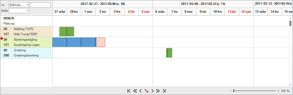 Fliken Beläggning är aktiv om LTK skapat tillverkningsorderförslag för att försörja ordern/orderraden. Här kan du se en beläggningsgraf för alla berörda produktionsgrupper på operationerna till den artikelnod som innehåller kritisk operation/material. Den artikeln visas på första raden. Du kan på raderna nedanför se hur operationerna ligger i förhållande till varandra som olika klossar.