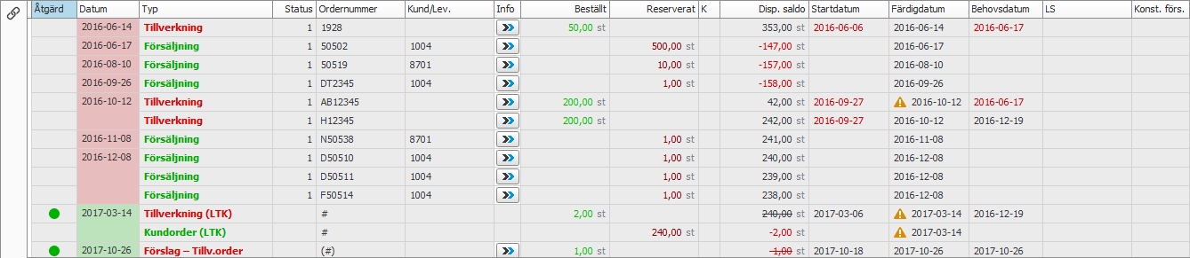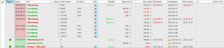 Planeringsbilden ser lika ut som den i rutinerna Artikelregister och Behovsberäkning. Kundorder, tillverkningsorder, förslag och materialbehov från LTK är märkta med (LTK) i kolumnen Typ.