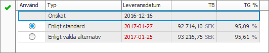 På första raden visas angivet leveransdatum/färdigdatum på ordern. På nästa rad visas vilket tidigaste leveransdatum/färdigdatum det blir med standard produktionsgrupper samt vad orderns täckningsbidrag och täckningsgrad blir. På tredje raden visas vilket tidigaste leveransdatum/färdigdatum det blir med de alternativa leverantörer och produktionsgrupper LTK valt samt vad orderns täckningsbidrag och täckningsgrad blir i det fallet.