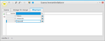 Registrera de bilagstyper som du behöver, förutom Faktura som följer med från start. Bilagstyper är en etikett för andra typer av dokument som kan läggas till scannade fakturor, exempelvis följesedlar, inköpsorder, reseräkningar m.m. När ett sådant dokument läggs till en faktura, med knappen Lägg till dokument