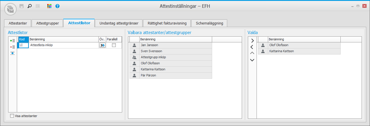 En attestlista kan ha Parallell attest. Om den inställningen aktiveras skickas fakturan ut på attest till samtliga attestanter samtidigt, dvs. fakturan behöver inte attesteras i sekventiell ordning.
