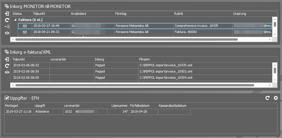 . Inkommande MONITOR-till-MONITOR e-postfakturor kommer sedan automatiskt att hamna i den särskilda inkorgen Inkorg MONITOR-till-MONITOR i rutinen Registrera leverantörsfakturor. Inkorgen finns också som skrivbordskomponent (se längre ned).