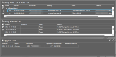 Komponenten Inkorg e-faktura/XML visar de e-fakturor/XML-filer som har inkommit. Komponenten scannar av de XML-inkorgar som registrerats i fliken Sökväg för inkorgar i rutinen Scanna leverantörsfakturor. Om du har fått fakturor kan du starta importen med knappen