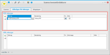 I boxen PDF-inkorgar på denna flik registrerar du minst en sökväg till en mapp som ska vara PDF-inkorg för inscannade pappersfakturor. Det är här som PDF-filerna ska lagras vid inscanningen.
