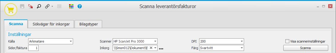 I denna rutin gör du inställningar för scanning av leverantörsfakturor. Dessa inställningar görs i MONITOR G5 på den dator som har scannern installerad. Rutinen kan du även använda för att scanna in nya pappersfakturor.