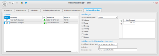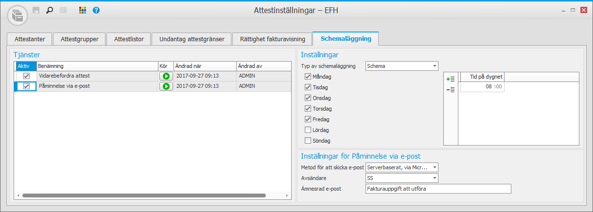 Aktivera de två tjänsterna Vidarebefordra attest och Påminnelse via e-post och ställ in ett schema eller tidsintervall i boxen Inställningar, som styr när tjänsterna ska köras. Med knappen Kör