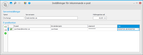 I denna rutin lägger du till ett e-postkonto knutet till en Exchange eller IMAP e-postserver och sätter typen MONITOR-till-MONITOR på kontot. Syftet är för att inkommande MONITOR-till-MONITOR e-postfakturor ska komma in i EFH-flödet. Med knappen Validera vald adress