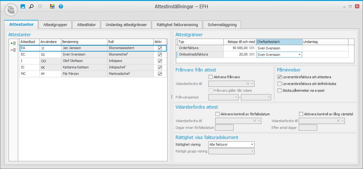 Lägg till de användare som ska attestera leverantörsfakturor. Komplettera med inställningar för Attestgränser, Frånvaro från attest, Påminnelser, Vidarebefordra attest och Rättighet visa fakturadokument. Den sista inställningen finns även under knappen EFH i rutinen Användare.
