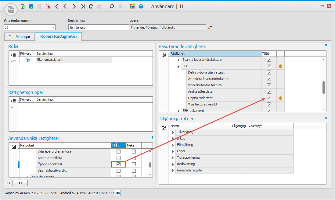 I bildexemplet ovan har en användare med rollen Ekonomiassistent även fått tillåtelse att öppna radattest, och det visas sedan i Resulterande rättigheter.