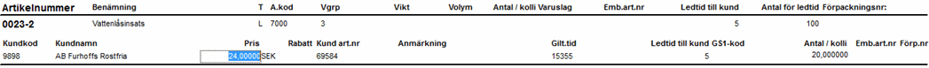 Uppdatering kan här göras (vid gruppering på Artikelnummer) av Pris, Rabatt, Kundens artikelnummer, Anmärkning, Giltighetstid, Ledtid till kund, GS1-kod samt Förpackningsnummer. Motsvarande går att uppdatera vid gruppering på Kundkod, förutom GS1-kod och Förpackningsnummer som inte går att uppdatera vid denna gruppering.