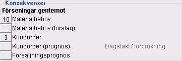 Med knapparna går det att filtrera i strukturlistan, t.ex. genom att i det här fallet klicka på knappen för Kundorder så visas enbart de 3 orderrader där förseningar uppstår gentemot kundorder.