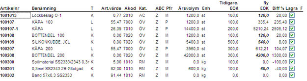 I listan redovisas Artikelnummer, Benämning, Artikeltyp, Artikelvärde, Artikelkod, Artikelkategori, ABC-kod, Partiformningsregel, Årsvolym, Enhet, Tidigare EOK, Nytt EOK, Diff % (differensen mellan tidigare EOK och ny EOK i procent) samt Lagra (markera vilka rader som ska lagras vid spara). En markering med ett rött utropstecken (!) i kolumnen F varnar för artikelns eventuella olämplighet av F (Fix kvantitet) som partiformningsregel.
