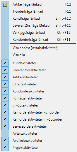 I påminnelsefönstret finns Informationsmenyn med följande val av aktiviteter. Det går att avmarkera de aktiviteter som inte ska visas.