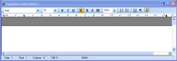 ClosedFönstret till rutinen är uppbyggt som ett ordbehandlingsprogram. Det består överst av en knapprad där det finns funktioner för att formatera dokument och text. Under knappraden finns en vågrät linjal som visar bredden på textområdet mellan marginalerna. Under linjalen finns en tablist där det går att klicka för att lägga in tabmarkeringar som valts på linjalen, eller göra olika indrag. Resterande del av fönstret är ett dokument där det går att skriva in text. I fönstret kan även hyperlänkar infogas till bl.a. webbsidor och till filer på disk.