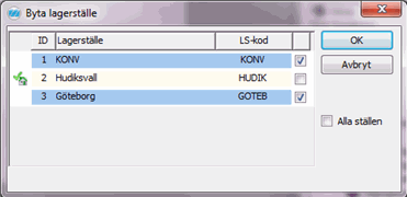 Klickar du på den knappen öppnas ett fönster där du kan välja lagerställe att arbeta i just för den rutinen. Det går även att använda knappen för att byta lagerställe för en viss order. En grön bock och ett litet hus visas för det lagerställe som användaren har som förvalt lagerställe. Markera det lagerställe du vill byta till och klicka OK. Du kan också välja flera lagerställen, se bilden nedan där två lagerställen är valda.