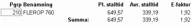 I lista Standard visas per ordernummer varje färdigrapporterad operation. Det går se ordernummer, artikelnummer, benämning, operation, färdigperiod, produktionsgrupp, planerad ställtid, avrapporterad ställtid samt effektivitetsfaktor. (Effektivitetsfaktor E = Planerad ställtid / Avrapporterad ställtid.)