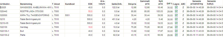 Listan visar efter beräkning, förutom övriga uppgifter, även värden på det gamla priset samt vad det nya priset kommer att bli samt differensen mellan dem. De artiklar som man inte vill lagra kalkyl på kan man nu avmarkera i kolumnen Lagra.