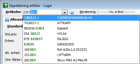 Exempel på snabbsök av artikelbenämning i artikelnummerfält.