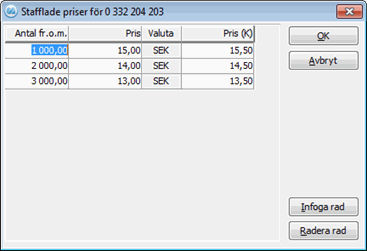 Tryck på knappen under kolumnen S för att få upp ett fönster där stafflade priser kan registreras. I kolumnen Antal fr.o.m. anges det minsta antal som ska säljas för att det stafflade priset under kolumnen Pris ska gälla. Det går att registrera ett obegränsat antal stafflingsnivåer på en artikel. Prislistans registrerade Valuta visas. Om även systemparametern Hantera kommande pris i prislista, kund-/lev.koppling är aktiverad, finns kolumnen Pris (K) där det då går ange ett kommande pris.