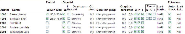 Här visas anställningsnummer, namn samt avdelning som den anställde tillhör. I denna lista går det att välja olika parametrar för hur arbete ska rapporteras och kopplas.