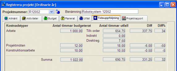 I fliken ClosedTidsuppföljning visas budgeterad och rapporterad tidsåtgång på projektet. Jämförelse mellan budgeterad och verklig tidsåtgång visas som Diff och Diff%.