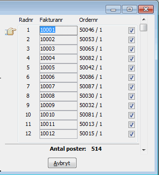 I detta läge hämtas alla fakturor inom det intervall som valts i den vänstra delen av fönstret. Det går att avmarkera de fakturor som inte ska skrivas ut. Längst till höger visas fakturastatus då proformafaktura ska skrivas ut. Detta är ett exempel på metoden "preliminärt urval". För att komma tillbaka till den vänstra delen väljs knappen Avbryt.