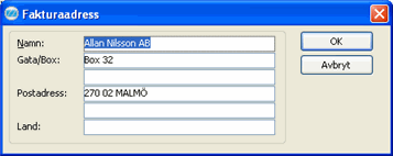Under knappen går det att lägga in en särskild fakturaadress på kunden om det är en annan än postadressen. Förvalt är det samma som postadressen.