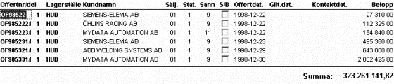 I lista Enbart summa visas endast det totala offertvärdet för det sorteringsbegrepp som är valt. I exemplet nedan är det för offertnr. Det kan även vara per period, kund, artikelnummer, osv. Om offerten ska ingå i simulering/behovsberäkning, Giltighetsdatum, Kontaktdatum samt Offertkategori går att uppdatera i listan.