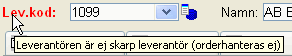 Endast leverantörer med status 1, dvs. skarp leverantör är möjlig att orderhantera. För kontakter med status > 1, visas ledtexten "Lev.kod" i rött. Det innebär att kontakten (ännu) inte är en skarp leverantör, utan en annan typ av affärskontakt.