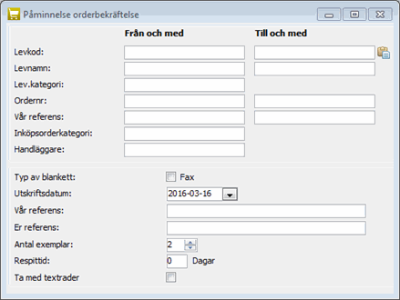 De parametrar som finns för utskrift här är Typ av blankett, Utskriftsdatum, Vår referens, Er referens, Antal exemplar, Respittid samt Ta med textrader.