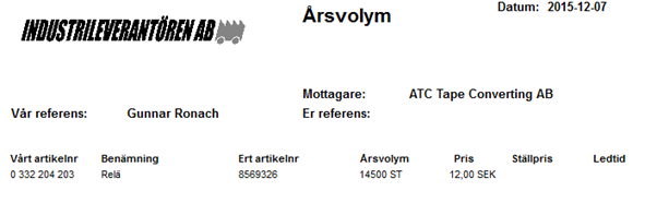 Därefter visas Vårt artikelnummer, Benämning, Ert artikelnummer, Årsvolym, Enhet, Pris, eventuellt Ställpris samt Ledtid.