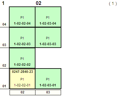 I utskriftsexemplet nedan är den gulmarkerade lagerplatsen befintlig och i det här fallet upptagen för att ett artikelnummer är anvivet högst upp i det gula fältet. De grönmarkerade lagerplatserna är lediga och nya. Blå färg samt understruken platsbeteckning visar att det är en ny plockplats. Om en lagerplats är spärrad markeras det med en röd genomstruken platsbeteckning. Det går att flytta i bilden med Page Up och Page Down.