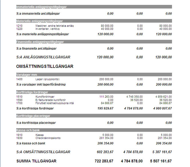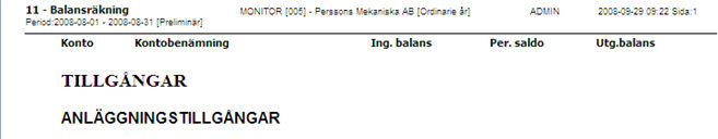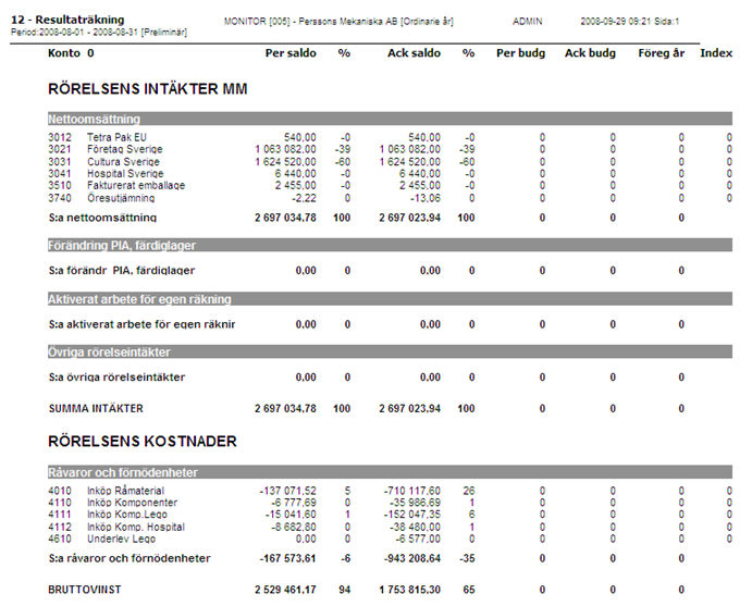 Exempel på en rapportutskrift. Exemplet är ett utdrag ur en Resultaträkning